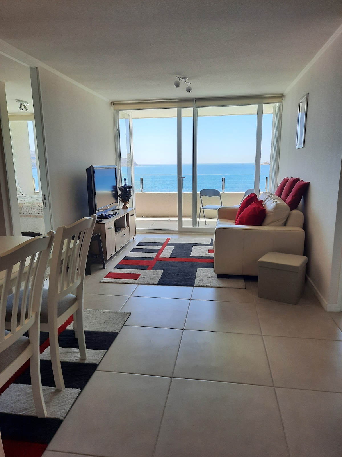 Davant de l'oceà, primera línia a la platja, al costat de Casino Enjoy. Vistes directes a l'oceà. Edifici amb tots els serveis, piscines, gimnàs, bugaderia, conserge les 24 hores, aparcament cobert. A poca distància dels millors restaurants, minimercats, carril bici i a 20 minuts de l'aeroport de Coquimbo. Pis totalment equipat, amb 3 habitacions, per a 6 persones. Disposa de televisió per cable, internet, cuina equipada, jacuzzi al dormitori principal, llençols i tovalloles.