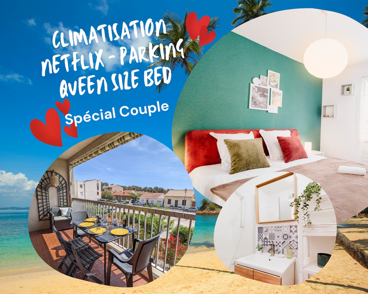 Pis lluminós d'una habitació totalment renovat amb vistes a un bosc de pins, sense passar per alt. Situat a 60 metres de la platja (supervisat en temporada) sense carretera per creuar, davant de les illes de Hyères (Port-Cros, Porquerolles, Le Levant... ) i a 10 minuts a peu del port de Miramar (trasllat a les illes i Saint-Tropez en temporada).