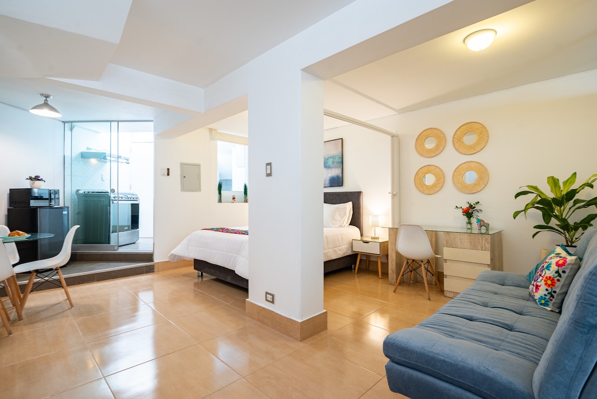 El millor allotjament a Barranco. Vine i gaudeix d'un espai tranquil i d'un districte que té el millor en turisme, cuina, museus i la platja. Estem situats davant d'un parc i a dues illes del Malecón amb vistes a l'oceà. Si t'agrada caminar o fer esport, aquest lloc és perfecte per a tu. Si vols treballar a distància, passaràs una estona increïble amb el televisor de 50", terrassa i, per als teus moments de descans, passa'l a la piscina amb vistes al mar. A poques illes de Miraflores.
