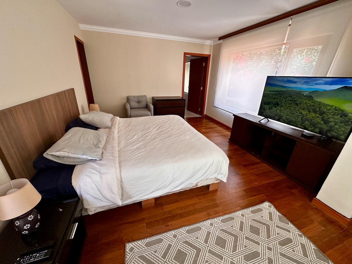 Departamento con espacios independientes, en piso alto, con ascensores, Wifi 5G rapido y estable, seguridad las 24 horas, a minutos del centro de la ciudad. Colchón de dos plazas y media de gama alta, almohadas con capa de GEL que brinda una refrescante sensación al dormir, para trabajar, agua caliente en ducha, lavado y cocina, amoblado y equipado, lavadora, TV - Netflix; todo nuevo con calefacción radiante. Cerca de supermercados, restaurantes, cafeterías, pub, panaderías y otros.