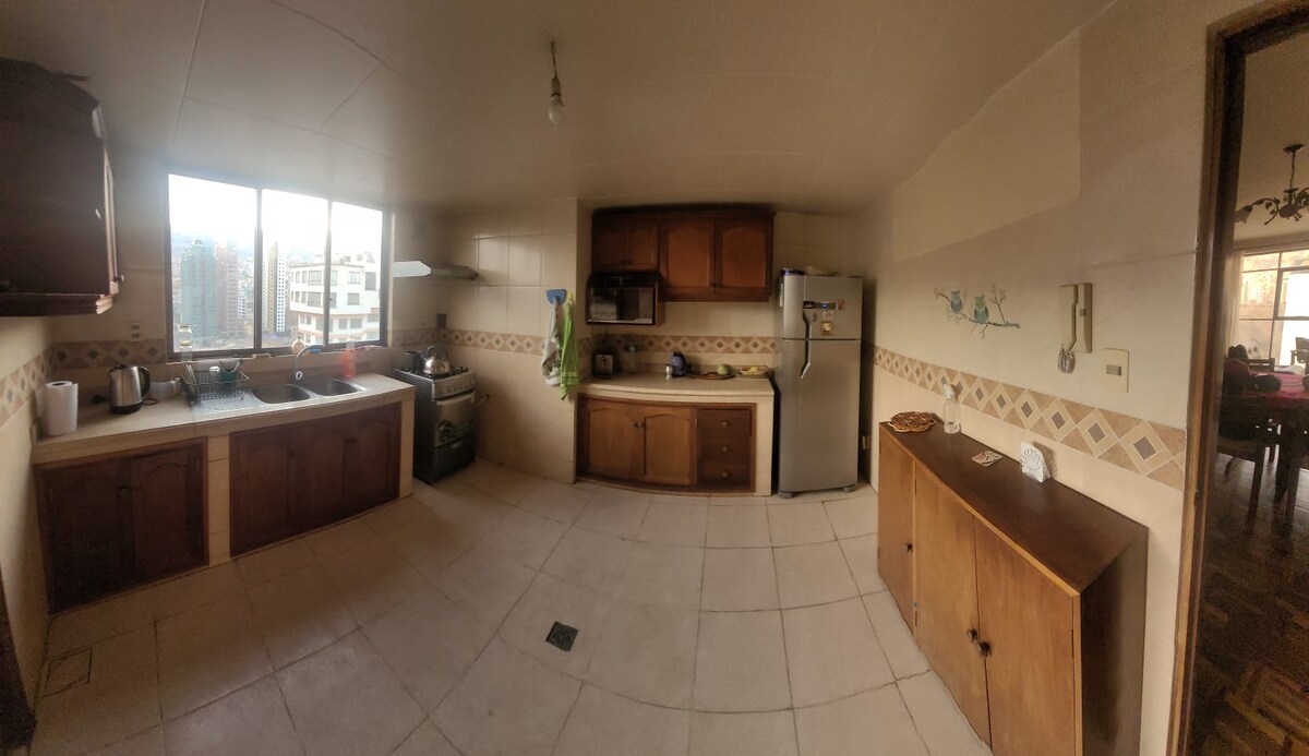 Exclusiva Penthause amb vistes panoràmiques incomparables del "Illimani" i la ciutat. - Situat al cor de Sopocachi, a prop de supermercats, restaurants i transport públic. - Wifi 5G - Cuina independent, Netflix, rentadora i aigua calenta. - Accés segur i privat amb ascensors panoràmics i seguretat les 24 hores. 1. Habitació principal amb llit «QUEEN size» per a 1 o 2 persones: 38 dòlars (la segona roman tancada) 2. Segon dormitori (opcional) amb llit doble disponible per 10 $ per persona.