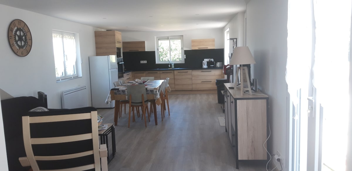 Casa renovada lluminosa de 45 m2 situada al centre del poble, a prop de diverses botigues ( fleca , botiga de queviures, carnisseria, pizzeria, restaurant ), així com una oficina mèdica. Aquest allotjament té una sala d'estar espaiosa amb capacitat per a 2 persones, menjador amb cuina oberta totalment equipada, dormitori espaiós, dutxa, vàter independent i menjador a l'aire lliure.