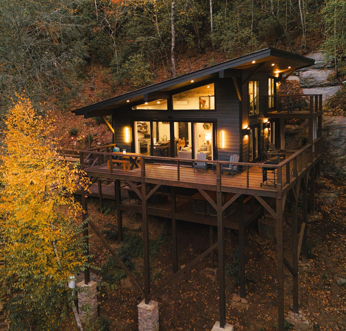 Cabana moderna als arbres a Toccoa amb cascada i banyera d'hidromassatge
