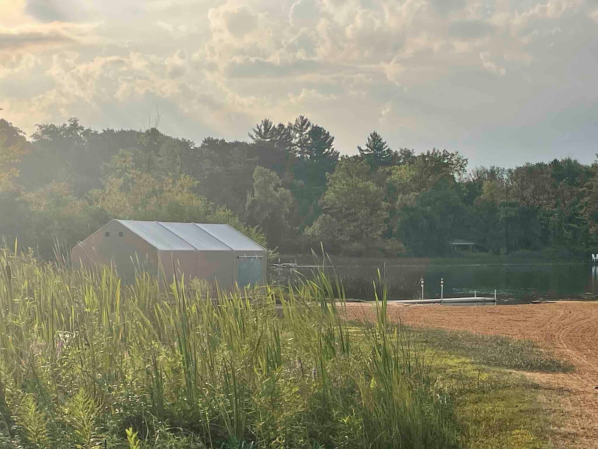Les nits de Michigan són cada cop més fredes, però les nostres gruixudes mantes fan que la tardor sigui acollidora. Gaudeix de la millor vida d'acampada fent servir l'estufa de llenya per escalfar aquesta tenda. Les nostres tendes de glàmping redefineixen l'allotjament a l'aire lliure. Et trobaràs en un entorn tranquil i natural. Gaudeix d'una nit de son realment tranquil·la al nostre llit «king size», amb un matalàs suau i llençols de luxe. L'interior espaiós de la tenda de 12 x 14 peus està decorat amb bon gust amb detalls ben pensats que creen un ambient realment acollidor.