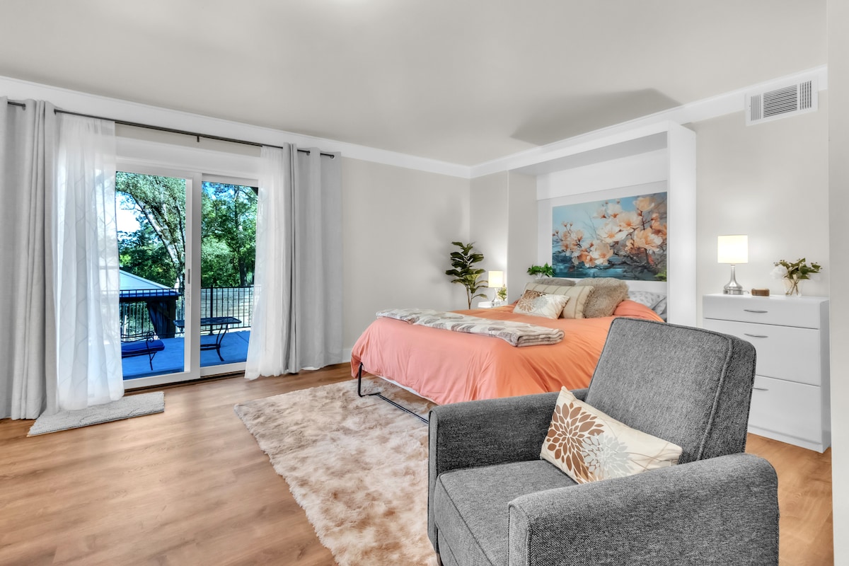 Enjoy a comfortable and stylish stay at this sparkling clean, centrally-located, pet & family-friendly guesthouse with private yard. Experience the convenience of a hotel, the hospitality of a bed and breakfast, and the amenities of a vacation rental! Fully stocked kitchen and bath. The freeway entrance and Highway 32 are just around the corner. Downtown Chico, Chico State, Bidwell Park, south Chico shopping, and the Sierra Nevada Brewery are all within one mile or less.