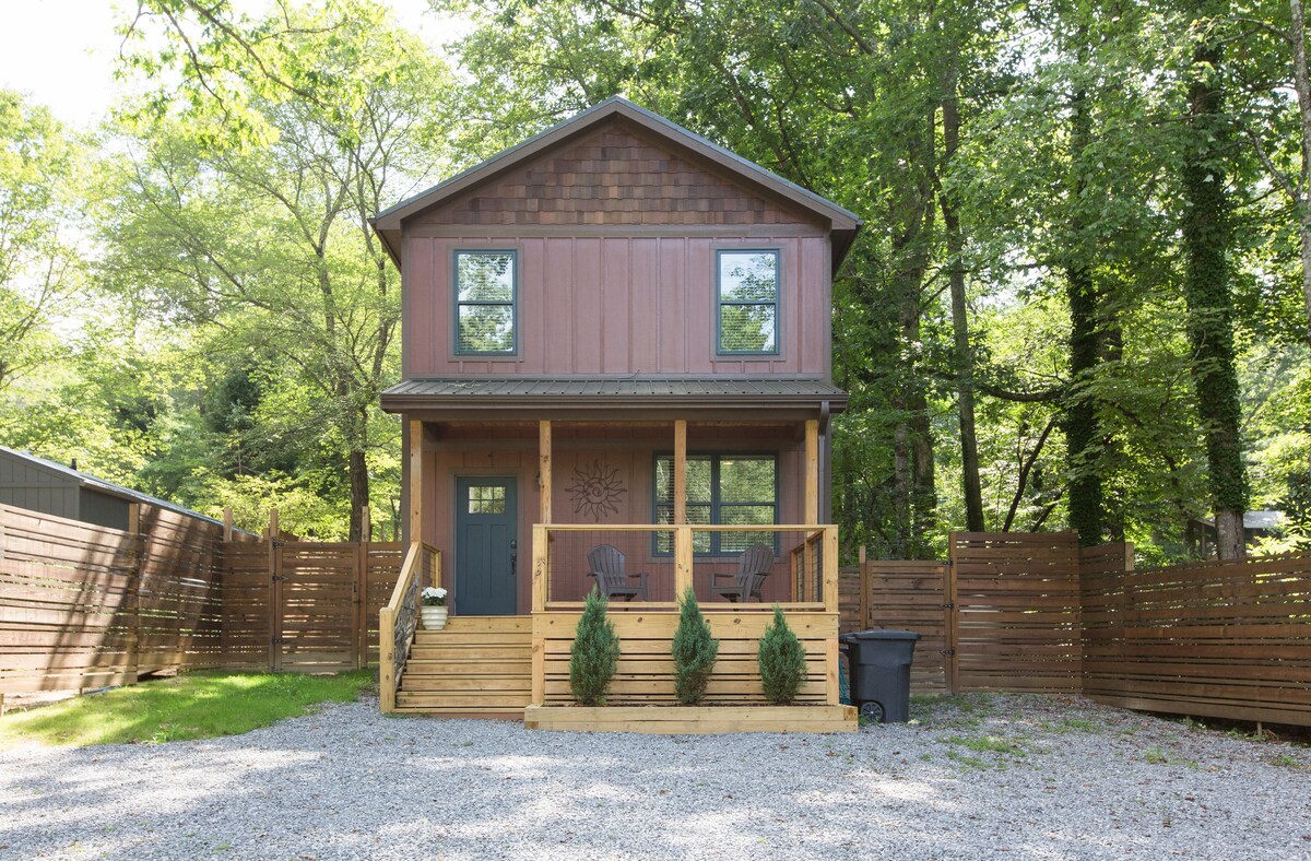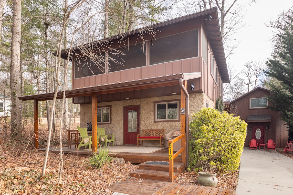 Deixa que l'estrès es fongui mentre prens un cafè en un porxo i escolta el cant dels ocells des dels boscos del voltant. L'interior també és tranquil, amb mobles seleccionats acuradament inspirats en el minimalisme, el terra de noguer i els taulells de la cuina elaborats localment. La casa es troba a uns dos minuts en cotxe del centre de Black Mountain i a uns 18 minuts del centre d'Asheville i del Biltmore. Tenim una xemeneia i cadires adirondak al pati del darrere per als nostres hostes. Fes foc i rosteja alguns malvavissats amb la família! Fins a dos gossos són benvinguts amb una tarifa única de 75 $ per animals de companyia. El nostre lloguer inclou tot el que els hostes necessiten per a una estada curta o llarga. Cuina totalment equipada per a aquells que vulguin cuinar. Bugaderia i assecadora inclosos. Estem disponibles per fer-te preguntes i fem tot el possible per respondre a les teves consultes tan aviat com puguem. Una experiència relaxant i agradable és la nostra prioritat. El bungalou es troba a pocs minuts a peu del llac Tomahawk, dels bonics camins i de les cascades properes. Visita cerveseries i restaurants de la muntanya negra local i explora els restaurants elegants i la vida nocturna d'Asheville, a 20 minuts en cotxe. A menys de cinc minuts en cotxe del centre de Black Mountain i a uns 20 minuts del centre d'Asheville. Hi ha Uber per arribar a qualsevol de les ubicacions si cal.