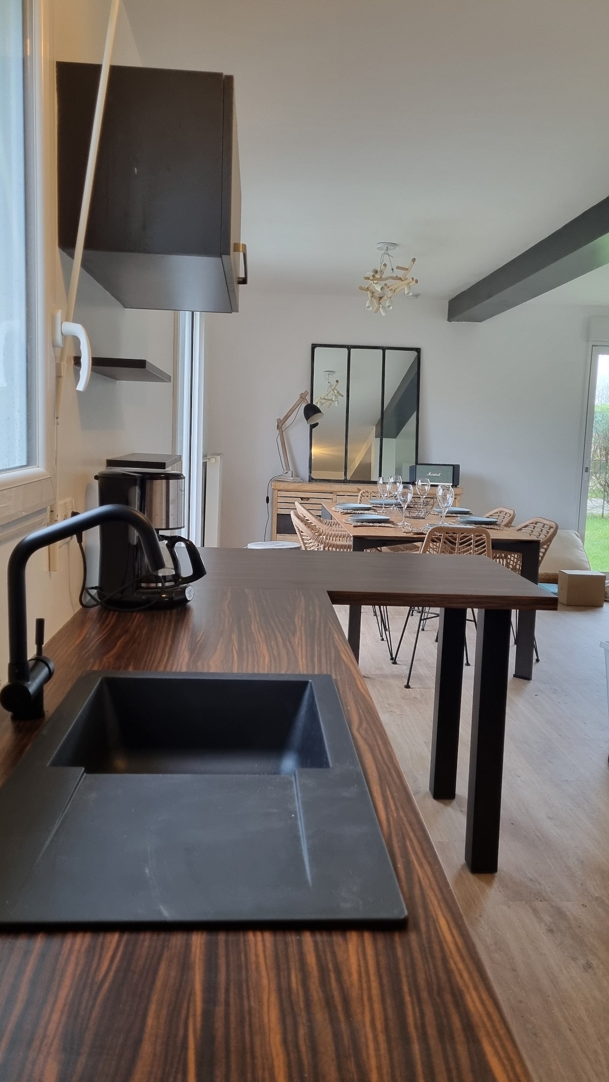 Allotjament nou en una zona tranquil·la situada a 5 minuts a peu del mar. A la planta baixa, sala d'estar/sala d'estar/cuina equipada amb accés directe a terrasses, suite principal, vàter i rebost. A dalt, dos dormitoris, bany gran amb banyera i vàter independent. Aparcament privat i jardí tancat.