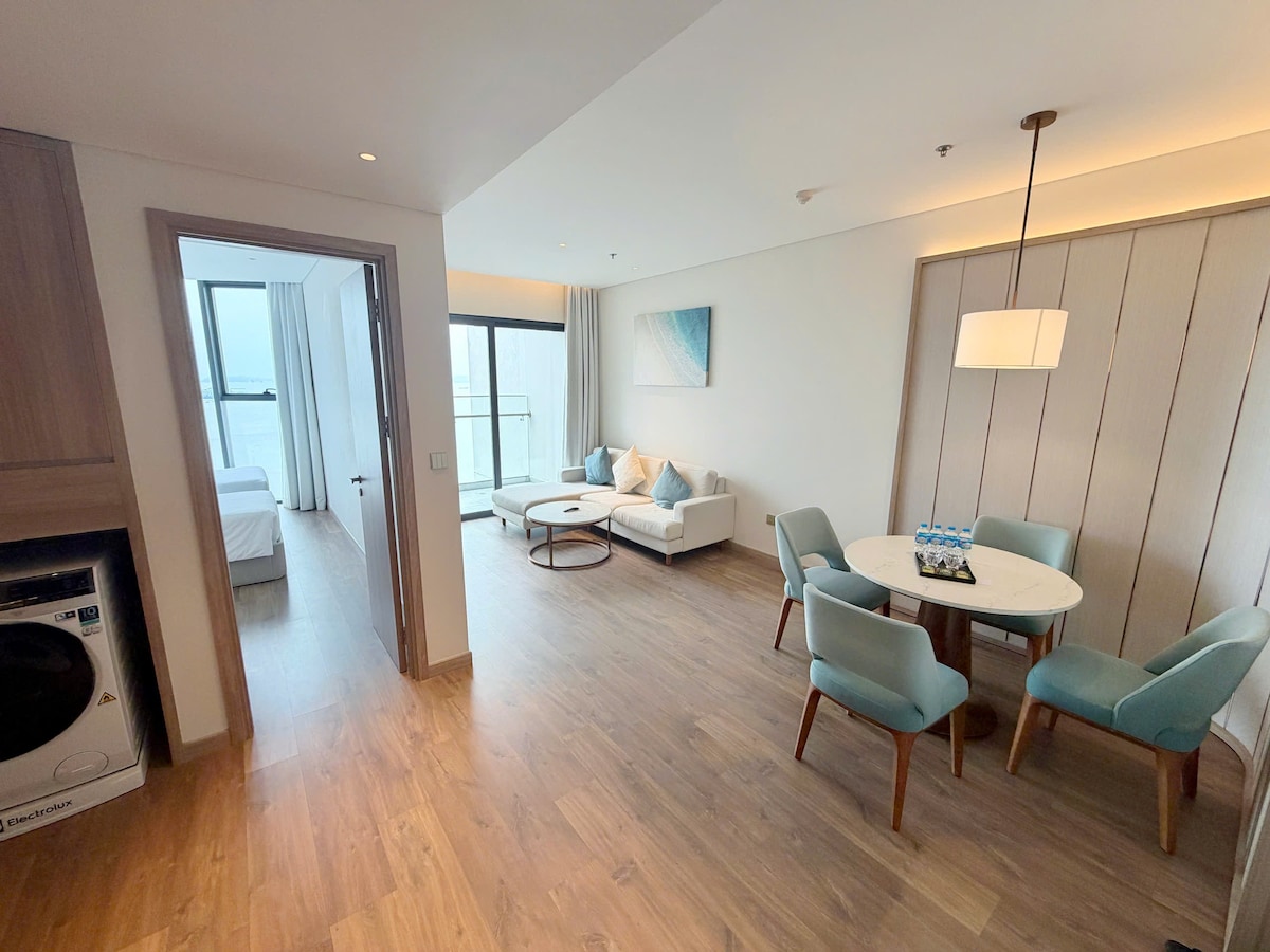 Gaudeix de la bellesa de la badia de Ha Long des de la planta 25. Gaudeix de la brisa fresca tot el dia a través de grans finestrals orientats al sud. Aquest pis té mobles moderns, cuina, bany, una mida queen i un gran llit de fusta per a jocs de te japonesos. Això es pot convertir en un llit per dormir, cosa que permet dormir 2 persones més. La sala d'estar té una capacitat de 48 polzades. Televisor d'alta definició, internet, aire condicionat, ventilador, armari, rentadora, microones, arrocera, bullidor, plats. El bany té aigua calenta i tots els serveis.
