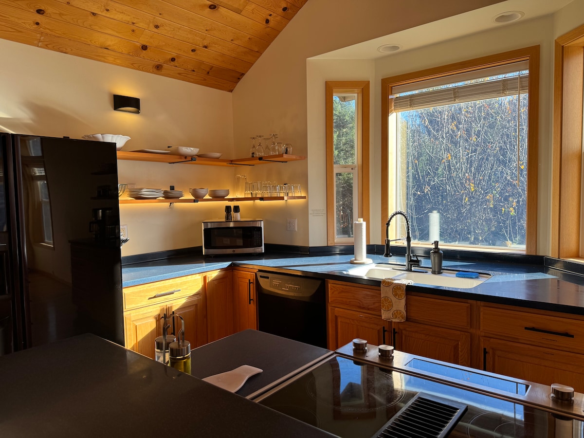 This clean and bright vacation lake house offers an amazing view of calm lake waters with a quick walk down to its new dock. All wheel drive or four-wheel-drive required to drive the 300’ gravel driveway to the house. Or park at top. Enjoy kayaking, swimming in summer or just sitting inside or outside watching the water and the neighboring birds - osprey, heron, geese, ducks, and sometimes bald eagles. 3 kayaks with a release. Off season it’s very quiet offering a personal retreat
