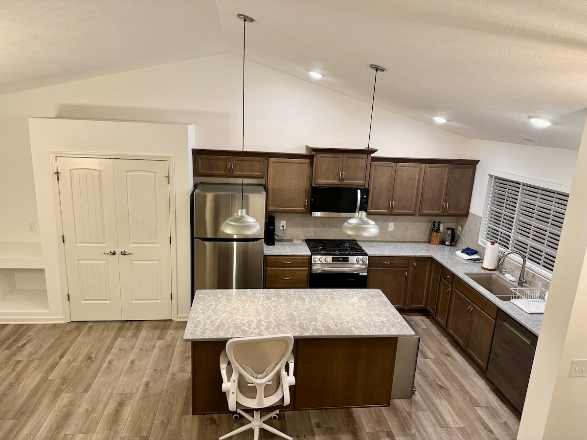 Entra en un espai privat i acollidor. Relaxa't veient la televisió al llit o al sofà. Aquest allotjament forma part del nostre soterrani, per la qual cosa és possible que sentis el dia a dia de la planta de dalt. Per la teva seguretat, hi ha una càmera Ring instal·lada a l'entrada i il·luminarà l'entrada quan estigui fosc. L'aparcament es troba al carrer públic ben il·luminat. Camina fàcilment per la nostra vorera d'Airbnb, sense esglaons, camina fins a la part posterior de la casa. Estaràs en un espai tranquil que et farà sentir com a casa.