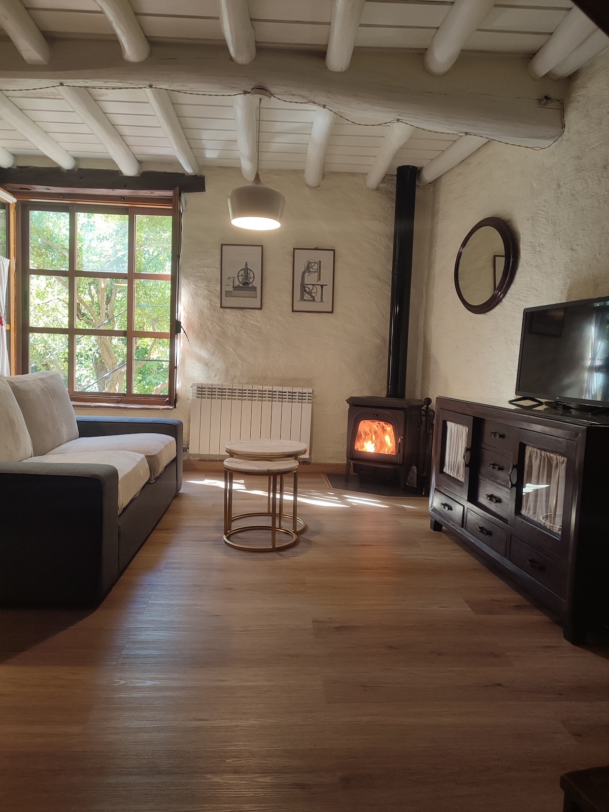 Casa independent ideal per a parelles i famílies petites. Aparcament privat i jardí, no compartit, porxo i barbacoa No és una habitació, és una casa rural preciosa. Habitació de concepte obert. Zona d'estar davant de la llar de foc i televisor intel·ligent, menjador amb cuina integrada, bany complet, pica doble i bonic dormitori amb llit XXL. Al costat de la sortida 375 de l'A66. Descansa ideal entre el nord i el sud Mira si vens amb un animal de companyia. La piscina està a 100 metres i és comunitària