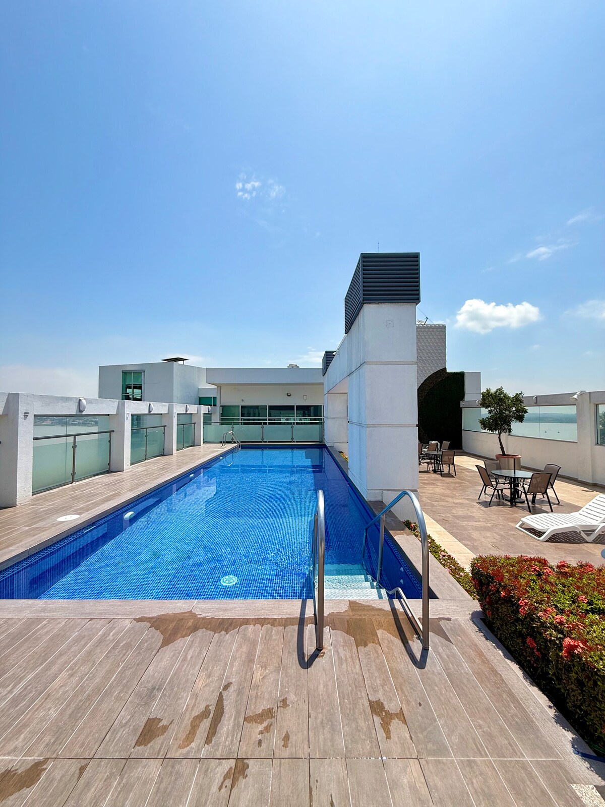 Acollidora suite amb vistes panoràmiques al riu Guayas. Està situat a la millor zona residencial i comercial de la ciutat de Guayaquil. A 5 minuts de l'aeroport i a 3 minuts de la terminal terrestre, pots anar a peu a restaurants, bars i supermercats, el sector té càmeres de seguretat, seguretat privada, policia nacional i conserge les 24 hores a l'edifici i als seus voltants. L'edifici té una gran zona social amb piscina, jacuzzi, sauna i gimnàs. NO ES PERMETEN VISITANTS