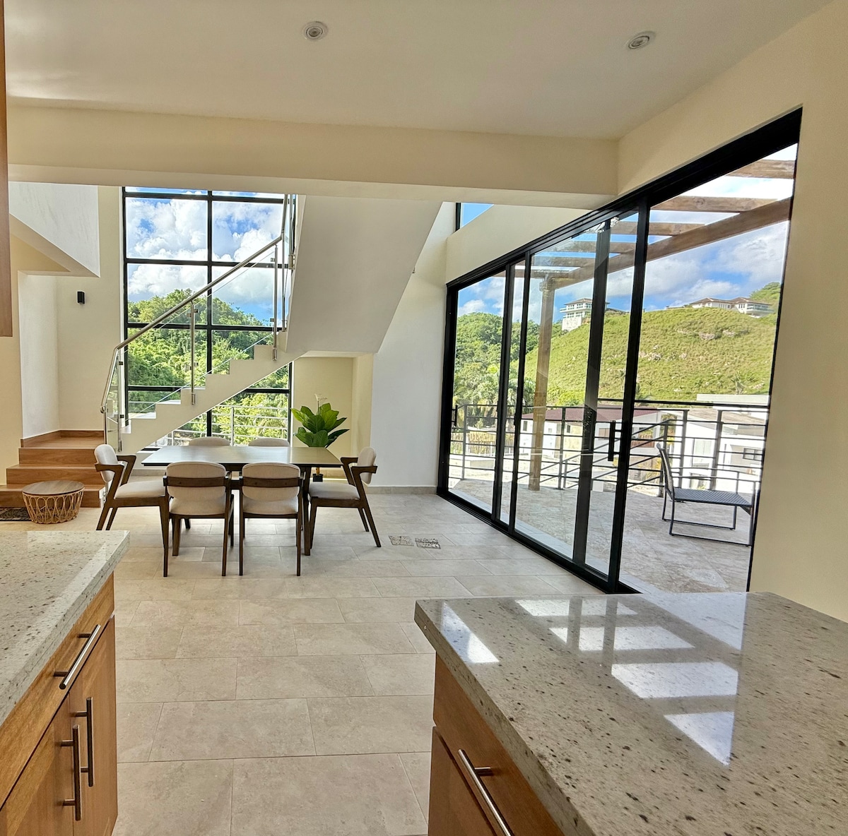 Relax in this private villa with stunning mountain views and a partial ocean view from the master bedroom terrace. Five minutes from Punta Poppy Beach and the town center, you'll have easy access to beaches, dining, and entertainment. The villa features three air-conditioned bedrooms—one king, one queen, and one full-plus multiple bathrooms. Enjoy a fully equipped kitchen, cozy living room, and outdoor recreation area/ private pool and garden.