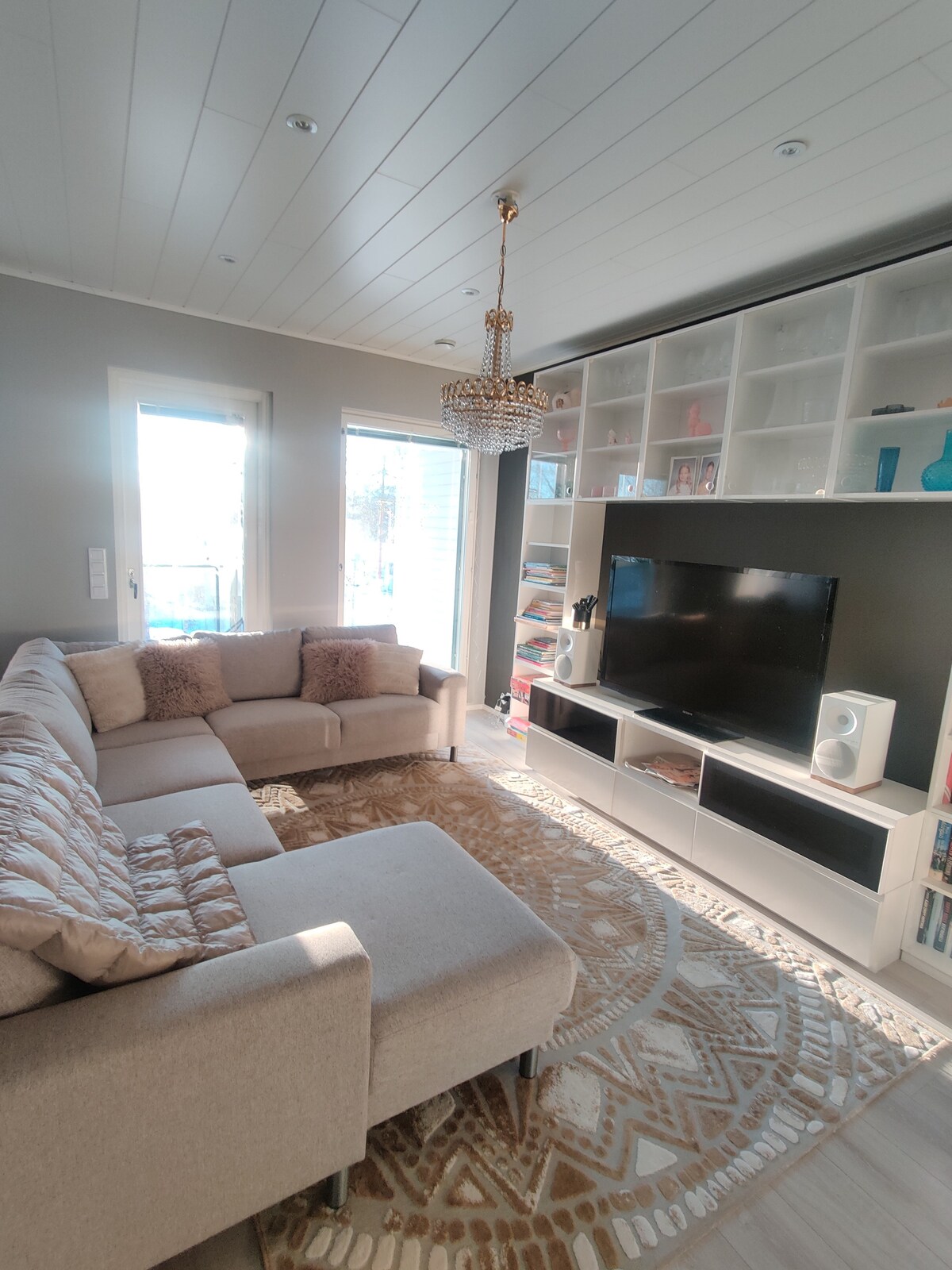 Una vil·la acollidora amb un garatge càlid a la vora d'un llac. La casa està elegantment decorada i hi ha tots els electrodomèstics moderns. La casa de més de cent metres quadrats és ideal per a una família o un grup d'amics. Una sauna de fusta, dues terrasses, una de les quals vidriada, i un ampli pati amb platja i moll propis garanteixen el teu benestar. També hi ha una barca de rems i un caiac disponibles.