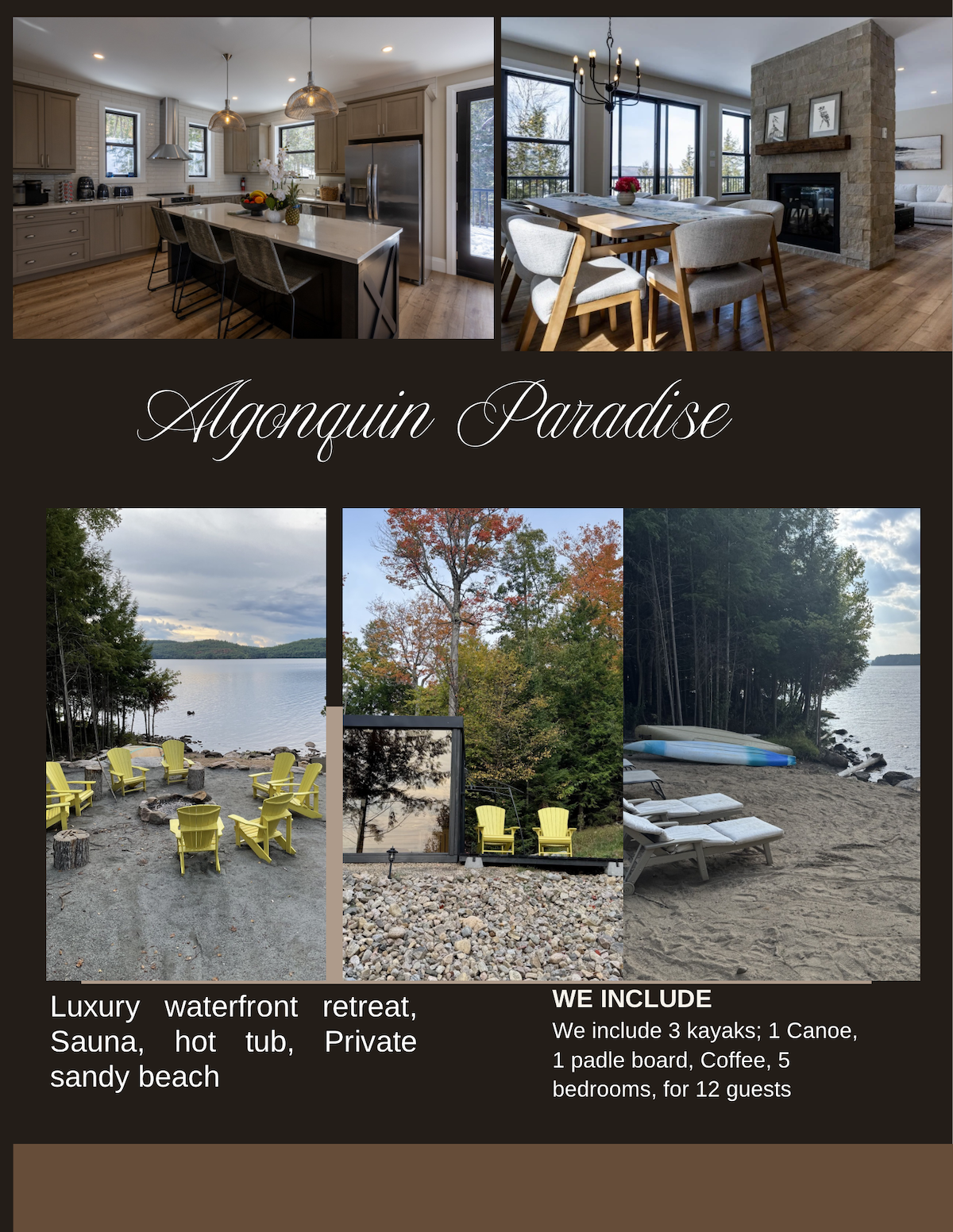Escapa't a aquesta luxosa casa rural boutique, un refugi perfecte de primavera i estiu amb 5 hectàrees d'exuberant vegetació. A només uns passos de l'ÚNICA platja pública de Golden Lake i a minuts de senders panoràmics, és ideal per nedar, fer senderisme i relaxar-se a la natura. A 3,5 hores en cotxe del GTA i a 1,5 hores d'Ottawa, aquesta escapada de luxe és perfecta per a parelles, famílies i grups petits. Tant si estàs prenent el sol, gaudint del llac o reunint-te al voltant del foc sota les estrelles, aquesta casa rural és la base perfecta!
