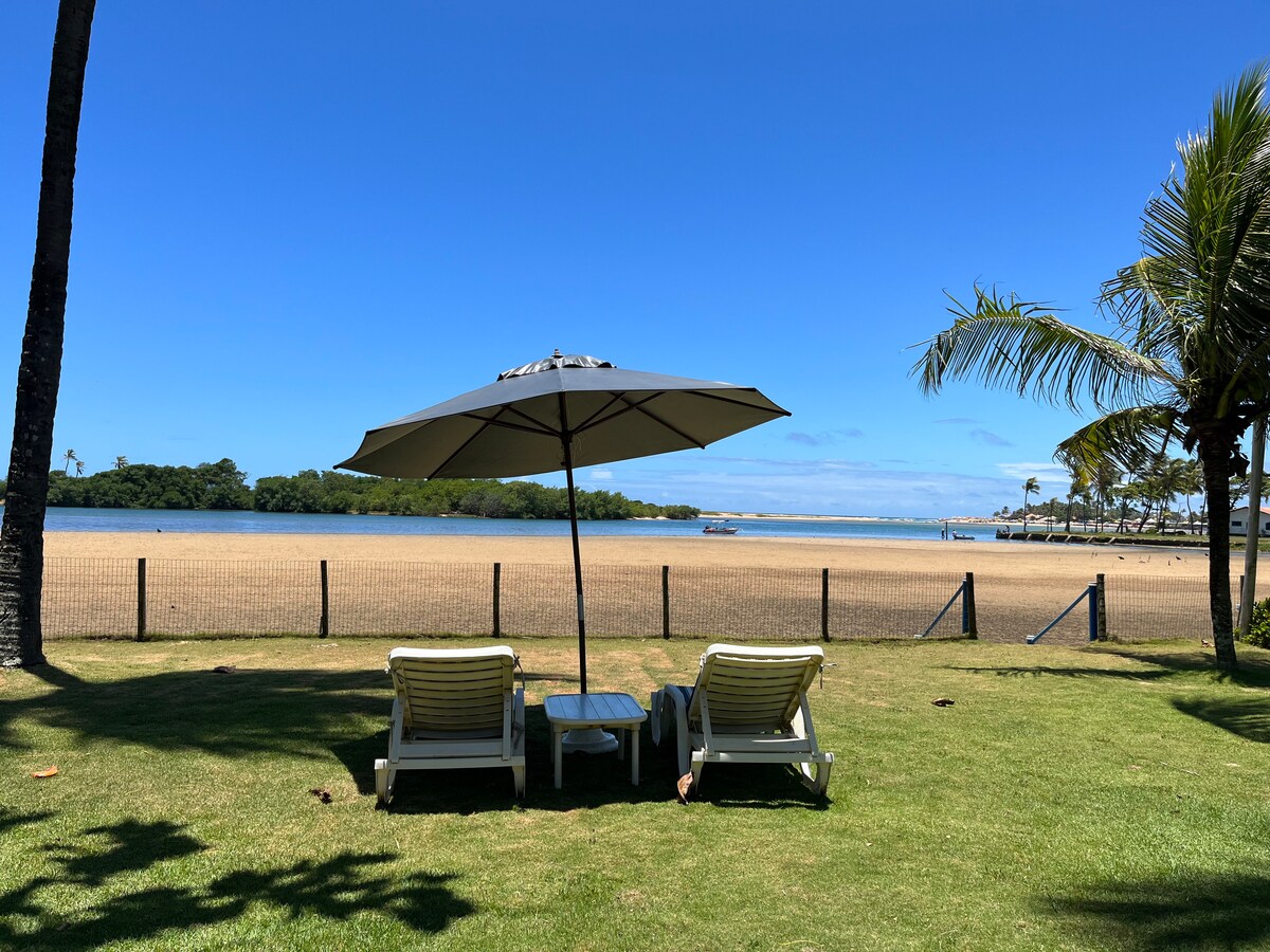 Sea view apartment in condo right next to the beach. Ideal for relaxing with friends, family or by yourself. Bedroom with air conditioner; Wide bathroom; Sofa bed and Dining table in the living room; airy balcony; integrated kitchen with blender, cookware and tableware. Wi-fi available (Internet fiber 30 Mega) - Great for home-office workers. Best location in Vilas: By the beach, a 8 km from the Airport SSA and 5 km from the center of Lauro de Freitas.