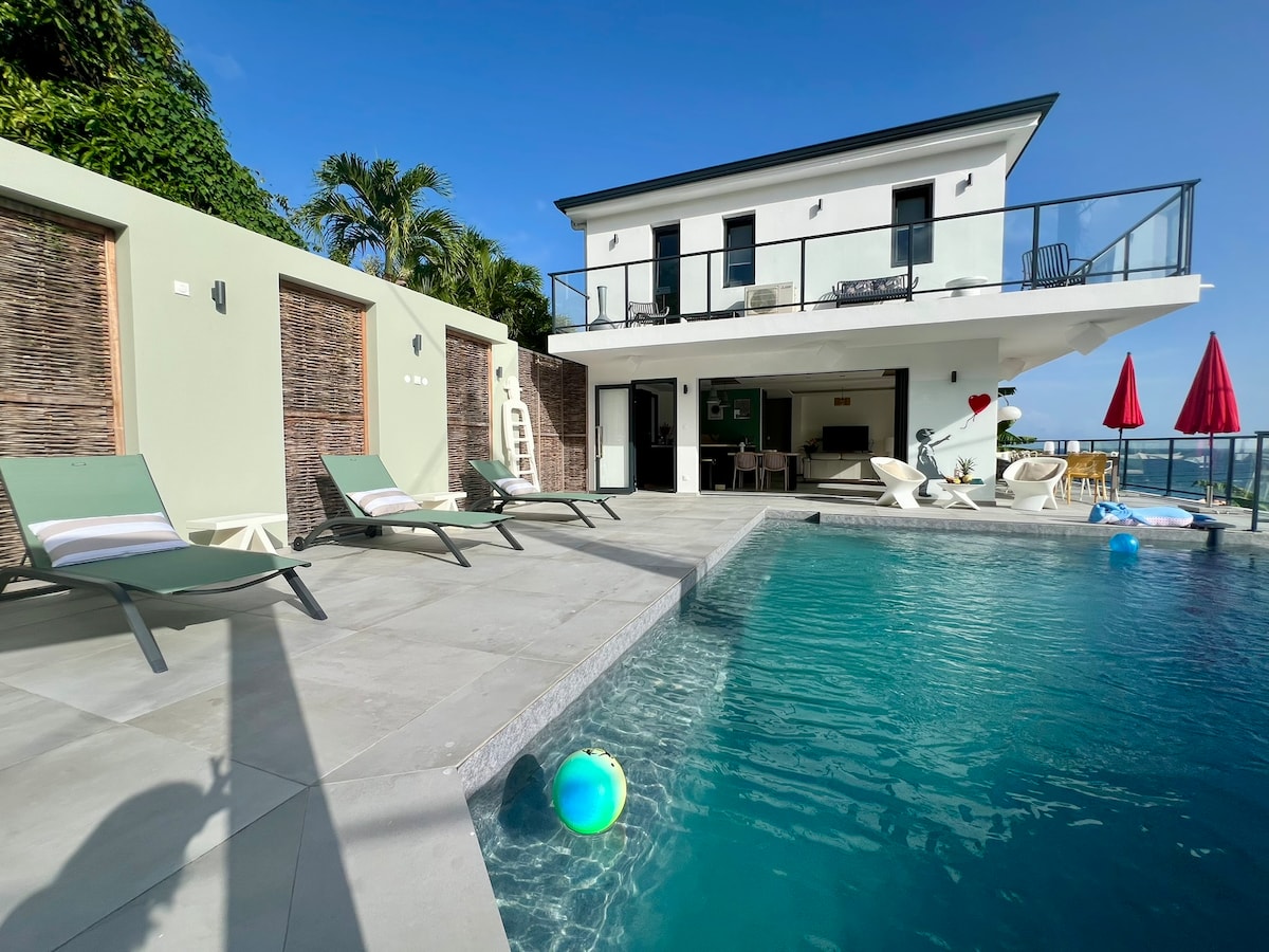 Des de l'alba fins al capvespre, Diamond Bay és el teu teló de fons. Aquest elegant i nou dúplex ofereix una vista espectacular de Diamond Rock i Morne Larcher. Dues suites amb aire condicionat (llits «queen size») amb terrasses panoràmiques, una cuina de disseny, una sala d'estar lluminosa i, a l'exterior, una piscina infinita amb vistes al mar. La platja és a poca distància i les botigues són a prop, per a una estada rara a Martinica combinant comoditat absoluta amb un entorn excepcional.