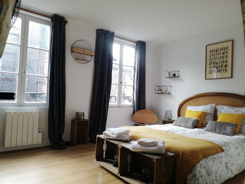 Les Câlins d'Honfleur was born out of a love affair with the town of Honfleur, its atmosphere, its narrow streets, its old basin. I imagined a welcoming place, in the heart of the historic district, 50 meters from the church of St. Catherine, easy to live, quiet and comfortable. Pierre's 41 M² apartment offers you all the comfort, a large separate bedroom with its Queen Size bed, a large living room / dining room with a fully equipped kitchen, a shower room and separate toilet.