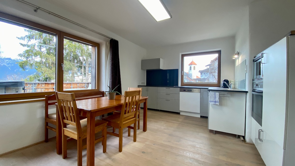 Terres de fusta, guix d'argila, mobles de fusta antics restaurats amb cura, el bany gran i lluminós. Aquest pis dona espai per relaxar-se i sentir-se còmode. La cuina i la sala d'estar és moderna i senzilla, et convida a cuinar i gaudir. L'espai habitable està inundat de llum, té una finestra preciosa i un gran balcó amb unes vistes precioses dels peus alpins. Dues habitacions acollidores i una petita sauna de guix d'argila fan que l'apartament sigui una petita casa temporal.