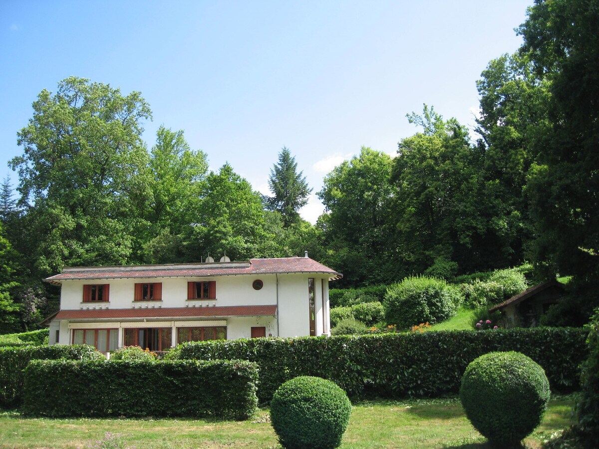 En un lloc màgic al cor verd de França, aquesta vil·la construïda amb arquitectura en una pintoresca vall a la vora del riu amb molta privacitat. La casa té capacitat per a 6 persones. 3 dormitoris dels quals 1 "llittee", cadascun amb el seu propi bany. Una sala d'estar encantadora amb estufa de llenya i una cuina moderna equipada. La façana de vidre ofereix una vista fantàstica de la vall. Hi ha una botiga de queviures al poble. Per relaxar-te, aquest és el lloc!