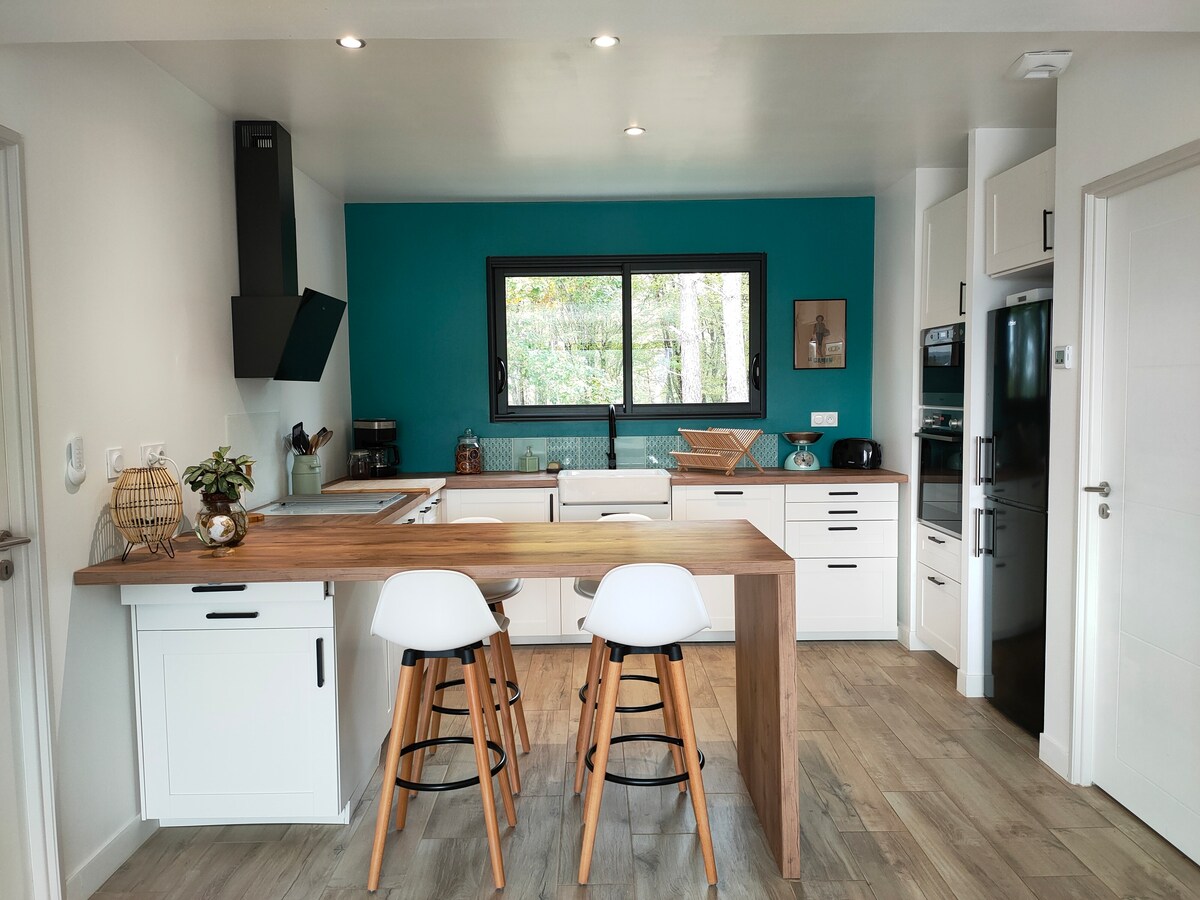 Vine a allotjar-te en un entorn verd i tranquil. A prop de Bergerac i de l'aeroport (20 minuts) A 5 minuts de l'A89, Bordeus (1 hora). Nova vil·la classificada amb 3 estrelles, orientada al sud, amb una terrassa de 65 m2 amb piscina i dutxa exterior. Parcel·la tranquil·la de 5.000 m2 per a unes vacances de somni. Zona de relaxació, barbacoa, pista de petanca Interior Cuina oberta totalment equipada, sala d'estar, menjador i dormitoris oberts a la natura. Habitació principal, dos dormitoris més amb dutxa.