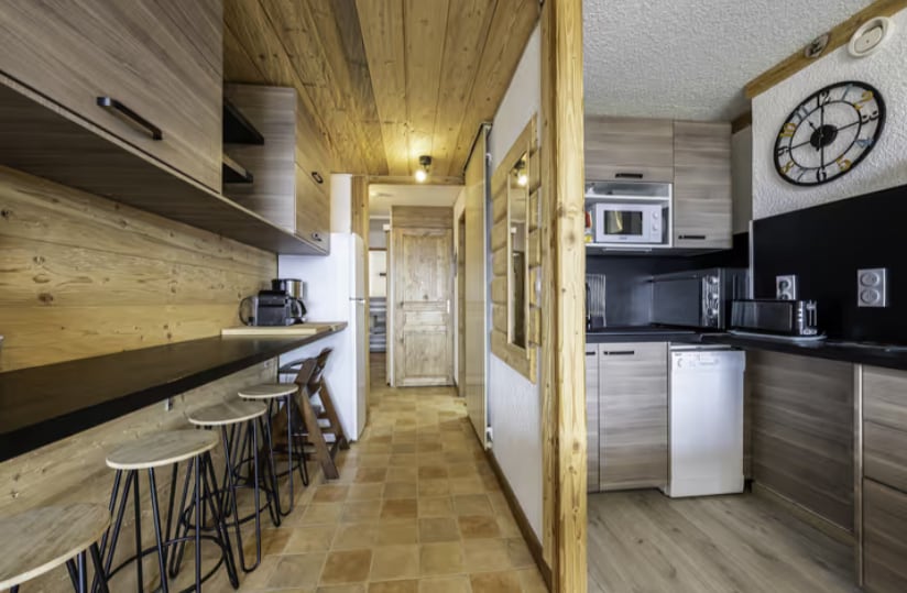 RESIDENCE DANDY. Planta superior de Le Hameau Mottaret. A un pas de les pistes, un pis modern reformat a finals del 2023 Estudi de 38 m2 + entresòl 5 llits com a màxim. 3 llits 80x190 (entresol) i 1 sofà convertible Ikea 140x200 (planta baixa) Àtic alt aïllat i tancat. Cuina moderna, equipada oberta a la sala d'estar. El bany amb dutxa italiana, rentadora i assecadora. Lavabo separat Balcó. No hi ha llençols ni tovalloles Taquilles d'esquí Wifi
