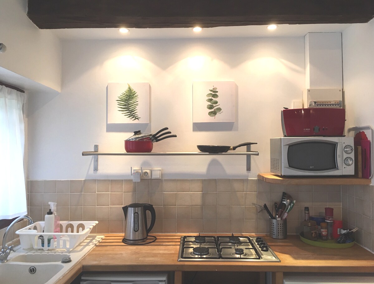 Fes pànxing i relaxa't en aquest espai tranquil, càlid i acollidor. Aquesta caseta està situada al final d'una carretera rural encantadora amb una vista preciosa de les valls. És fàcilment accessible, amb una cuina totalment equipada a la planta baixa, 1 dormitori per a 2 persones, bany i lavabo independent. A l'entresol, amb un llit per a 2 persones. Novetat: sala d'estar amb sofà llit + entresol. Una terrassa et convida a relaxar-te. Els propietaris, que són molt discrets, viuen a 30 metres. Piscina a partir de maig.