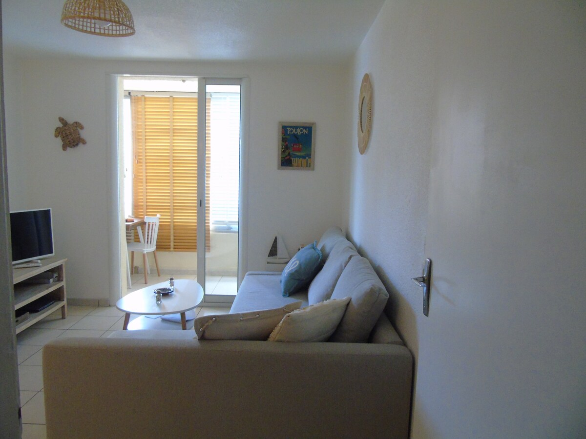 Estudi de 34 m2 amb aire condicionat situat en una residència segura al mig d'un bosc de pins, amb balcó, plaça d'aparcament privada gratuïta, piscina sense calefacció del 15 de maig al 15 d'octubre, cuina equipada, televisió, wifi gratuït, rentadora, armari, roba de llit i tovalloles. La platja de sorra "Les Sablettes" es troba a 250 m de distància. Lloc de excursions i activitats aquàtiques precioses. A poca distància de botigues, restaurants, mercats, connexió directa en vaixell o autobús al port de Toulon i a l'estació de tren.