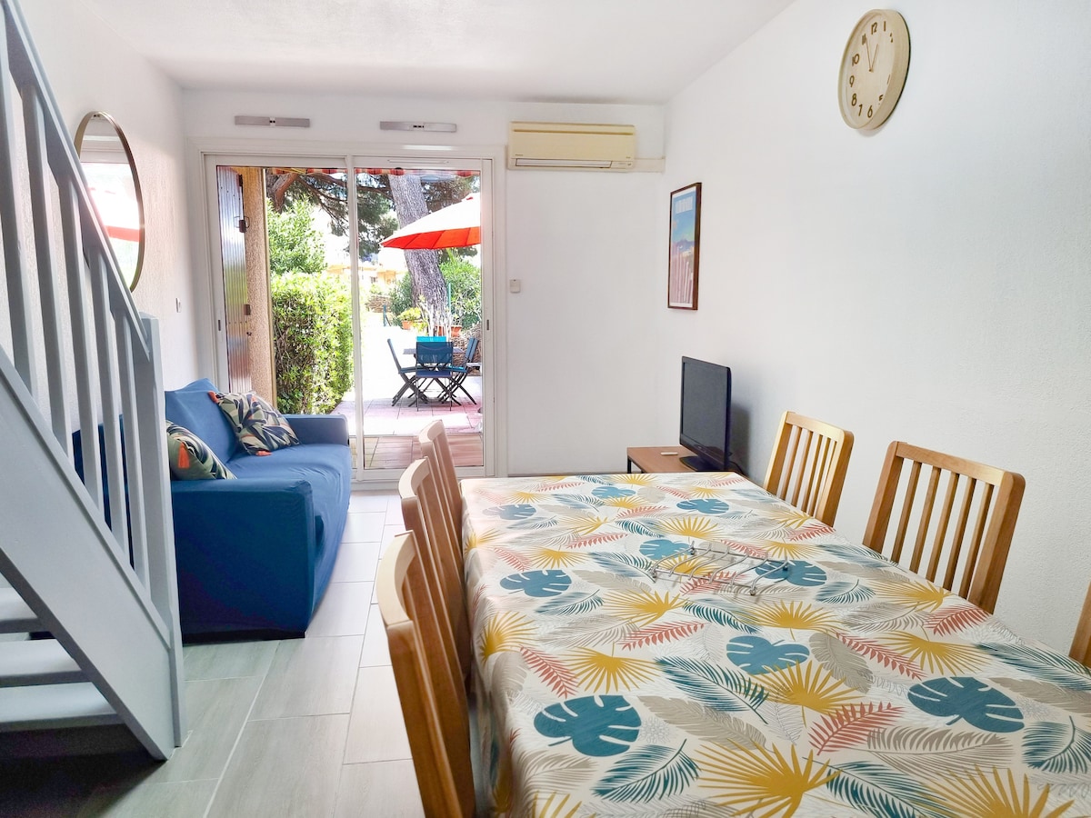 Relaxa't en aquest espai únic i tranquil. Entorn dúplex protegit a la primera planta davant de les illes de Hyères, accés directe a la platja, aparcament A la planta baixa: bany amb vàter, cuina, sala d'estar amb 140 sofà llit i terrassa amb vistes al mar. A la planta superior 1 dormitori amb un llit de 140 llits, armaris grans, televisor i ventilador de sostre + entresòl amb sofà llit 140 Per motius de seguretat (entrepà obert, escala de caracol ), la sala d'estar no és recomanable per a famílies amb nens petits.
