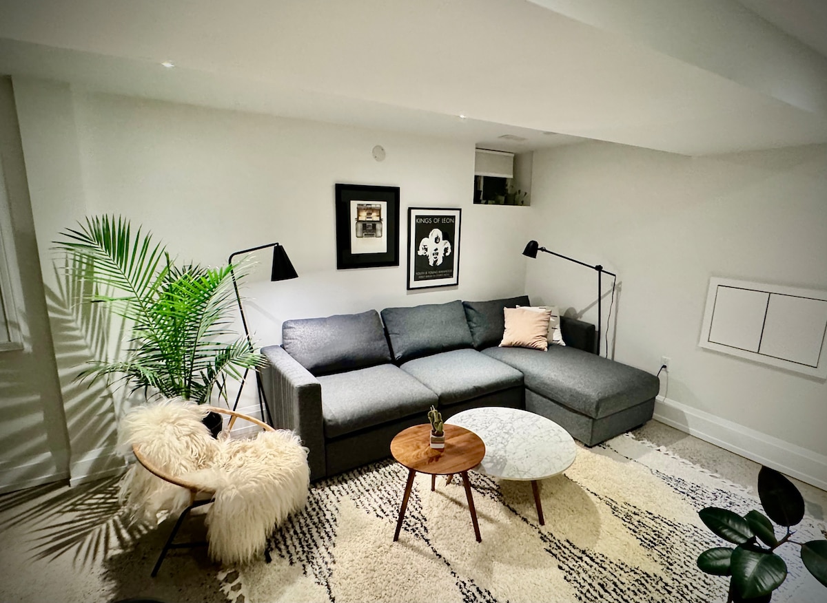Gaudeix d'un apartament soterrani espaiós d'1 dormitori de nova construcció, dissenyat professionalment a East York Toronto. Convenientment situat a prop de Danforth, Woodbine Beach, parcs i senders, l'apartament està a poca distància en autobús/metro o a 15 minuts en cotxe del centre de Toronto. Autònom i espaiós, ofereix una cuina totalment equipada, serveis de bugaderia nous, un llit queen size, un ampli emmagatzematge i molta llum natural.
