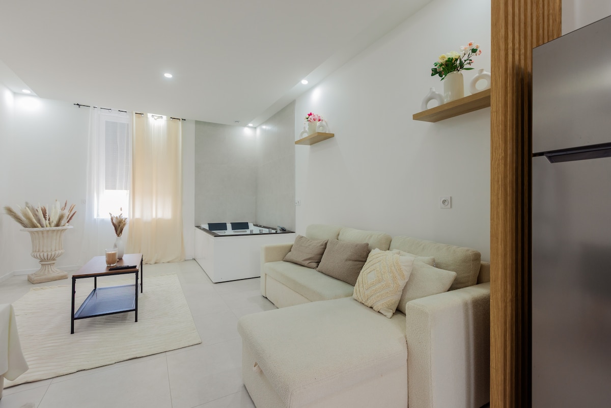 ✨ Pis T3 acollidor amb jacuzzi privat. Gaudeix d'un moment de relaxació únic en una banyera d'hidromassatge instal·lada directament a la sala d'estar, en un ambient càlid i íntim. Ideal per a una escapada en parella o una estada amb amics, aquest allotjament totalment equipat t'ofereix totes les comoditats que necessites: llits còmodes, cuina, wifi d'alta velocitat, roba de llit... Només has de deixar les maletes! Accés 🅿️ fàcil amb aparcament just al davant. Centre comercial🏪 petit a la volta de la cantonada.