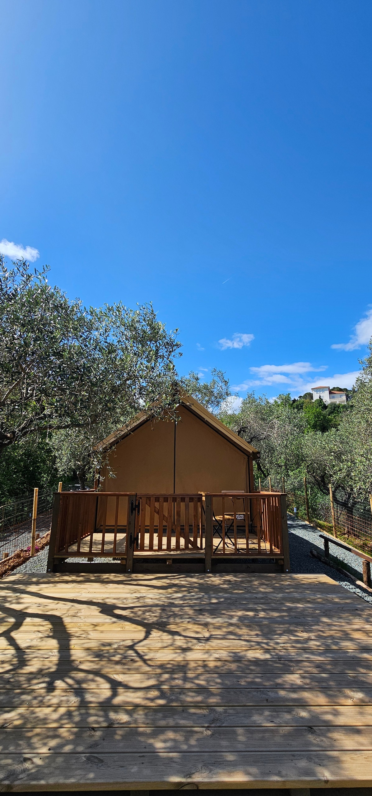 Tenda de campanya per a 4-5 persones en plena natura. Una experiència autèntica i relaxant a pocs minuts del mar. 1 llit doble, 1 llitera amb un tercer llit desplegable, nevera. A l'exterior hi ha una cuina privada amb dos fogons d'inducció (sense pica, disponible a les zones comunes) i un espai cobert per menjar a l'aire lliure. Bany, pica i dutxa comuns (1 €). Zona de barbacoa compartida. Zona de relaxació privada amb gandules. Piscina inclosa.