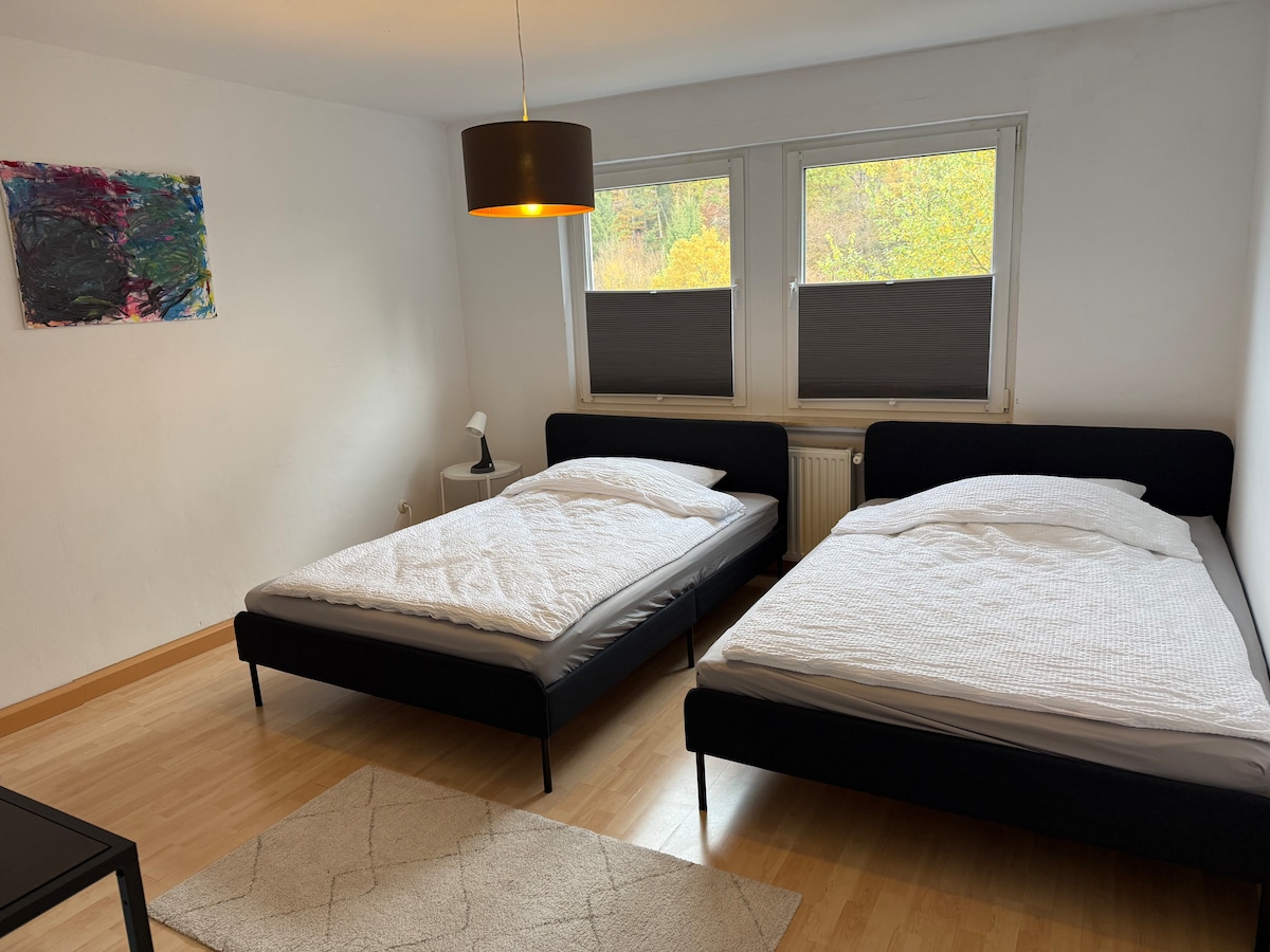 Llogem aquest preciós annex (aprox. 60 m2) amb entrada independent i accés directe a la natura al Sauerland. El pis té un dormitori doble per a 2 persones i una altra habitació amb sofà llit per a 2 persones . Opcionalment, és possible utilitzar el sofà llit d'alta qualitat de la sala d'estar per a 2 hostes addicionals. El sofà llit té un matalàs integrat per a les persones que dormen de forma permanent. Et beneficiaràs de wifi gratuït i aparcament privat a l'allotjament.