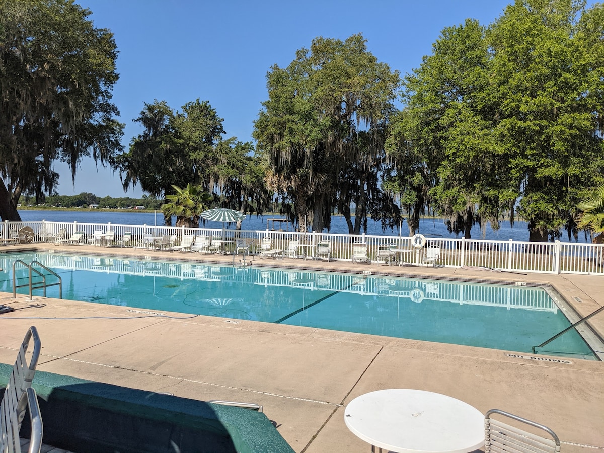 Complex turístic tancat amb accés a piscines, banyera d'hidromassatge, pistes de pickleball, rampa per a embarcacions, parc infantil i un parc per a gossos (amb una zona per rentar gossos)! Salt Springs és just a l'altra banda del carrer, Silver Glenn Springs és a prop. A poca distància a peu hi ha un Dollar General, un Salt Springs Pizza i una bugaderia automàtica. PS: El complex turístic cobra una tarifa de 35 $ a tots els hostes (no per persona!) i també pot cobrar un suplement per embarcacions, remolcs, etc. P.S.: S'han vist ossos al complex turístic, així que et preguem que deixis tot el menjar i les escombraries a la casa!