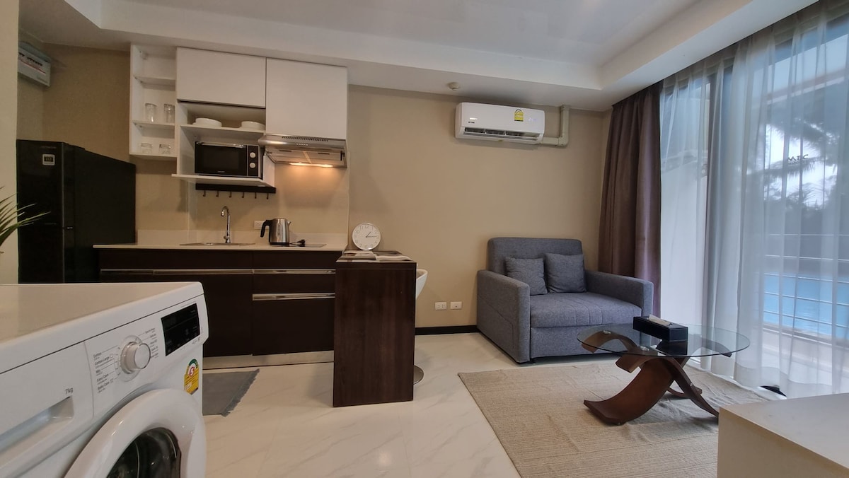 Pis de planta baixa de 36m² amb accés a la piscina a través d'una porta de balcó. Tot el que necessites per gaudir d'una estada còmoda. Cuina completa, nevera, microones, rentadora, sofà plegable. Des del MBC fins a la platja està a 500 metres, hi ha una infraestructura ben desenvolupada, cafeteries, botigues, parc aquàtic Splash Jungle als voltants. T'encantarà el barri si vius a la gran ciutat i vols relaxar-te de la gran quantitat de persones, llavors Maikao és la millor opció entre totes les platges de Phuket!