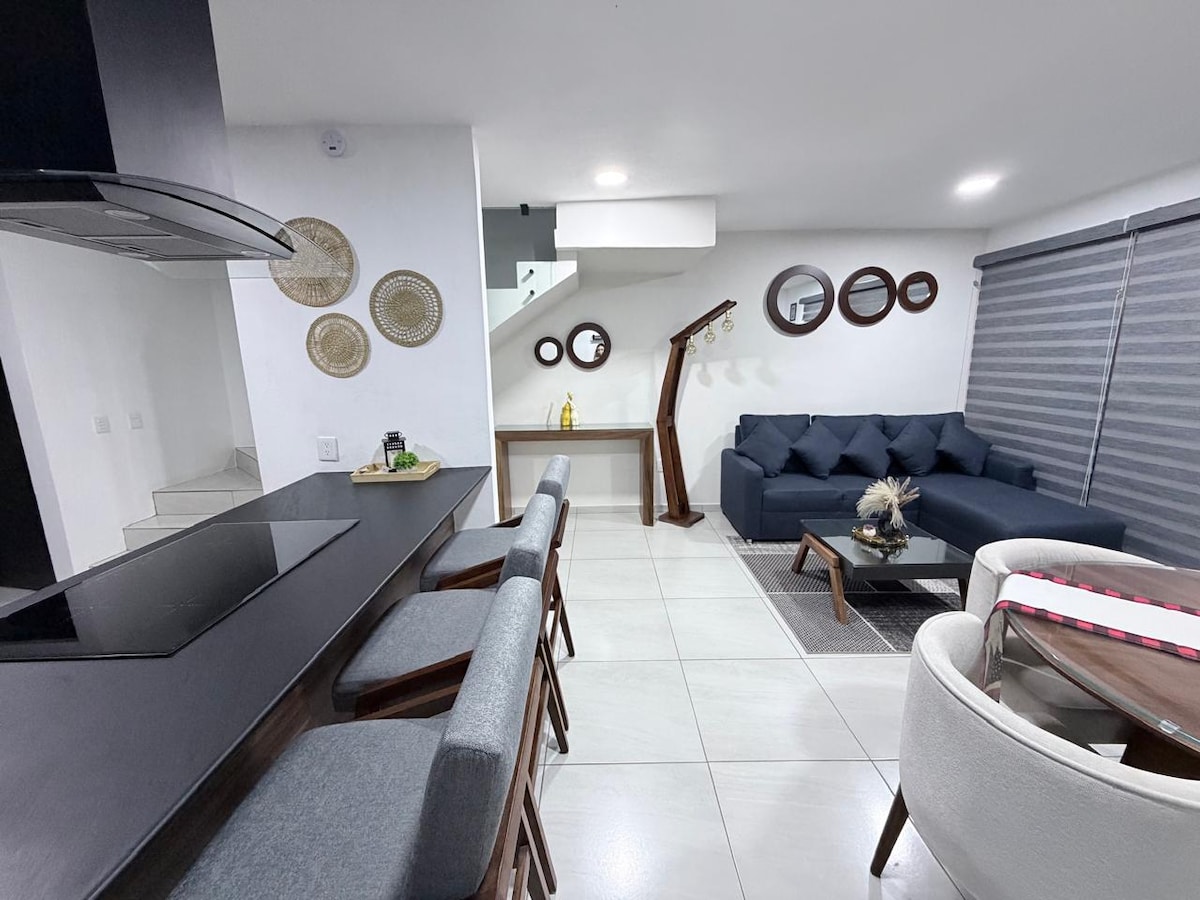 Pis luxós i preciós amb disseny art déco i mobles, relaxa't i gaudeix de les vistes perquè està en un 9è pis, disposa d'equipament i serveis com una piscina pintoresca, gimnàs, teulada panoràmica, sala social, barbacoes, seguretat i ascensors. L'apartament té una habitació amb llit queen size, un bany complet, bugaderia, cuina completa, nevera amb màquina de gel i dispensador d'aigua freda. Oferim 2 tovalloles per a la dutxa i 2 tovalloles per a la piscina. També oferim visites a la ciutat i als pobles màgics.