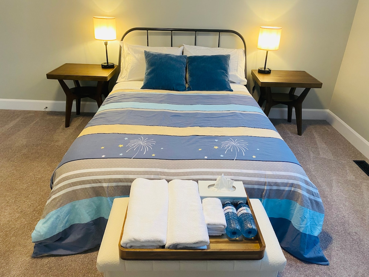 Welcome to your private lower-level suite featuring a bright bedroom, a versatile den/office, and a spacious living room. The suite offers a full private bathroom and a small kitchenette for simple meals, plus access to a fully equipped shared kitchen on the main floor. The shared front entrance leads directly downstairs to the suite. This space is ideal for guests needing extra room to work, relax, or stay for longer visits while enjoying a quiet, comfortable setting.
