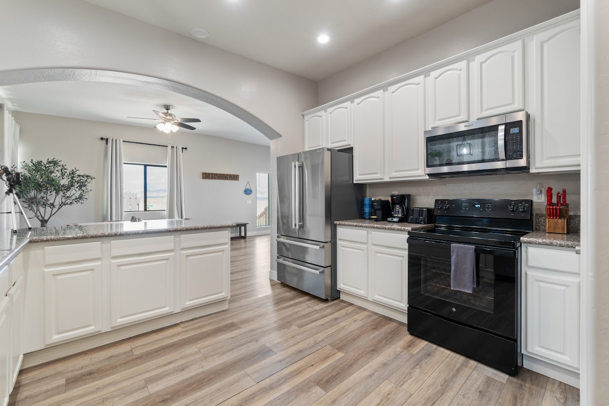 LAKE POWELL IS OPEN and ready for summer adventures! The Stateline launch ramp is fully operational, and there’s plenty of space for boating, sightseeing, and enjoying the views. This newer 4-bedroom, 2.5-bath home is in the sought-after, peaceful Greenehaven neighborhood, just minutes from Page, Wahweap Marina, Antelope Canyon, and endless adventures. Enjoy stunning views of Lake Powell and the sunset’s alpenglow on the canyon walls through oversized sliding doors.