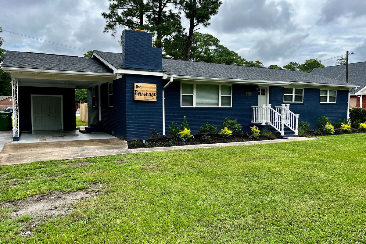 ET DONEM LA BENVINGUDA al nostre acabat de renovar 3 llits i 2 banys, apte per a famílies i animals de companyia, Midtown Parsonage. Dissenyable d'una manera tranquil·la, senzilla i còmoda. La família pot relaxar-se al nostre espaiós allotjament, gaudir de la zona exterior de la foguera! Convenientment situat a 3 minuts del parc aquàtic Jungle Rapids (Arcade & Go Carts), a 2 minuts de UNCW, a 10 minuts de la platja de Wrightsville i a 10 minuts del centre històric de davant del riu. El centre de Wilmington!