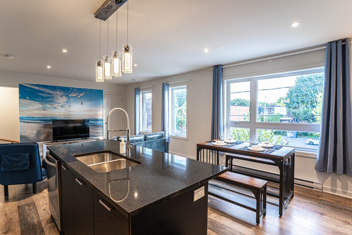 Charm & Luxury! This Stunning fully equipped 2 bedrooms apartment on 2 floors located in a brand new Triplex (2018) with a small balcony will provide you with a one of a kind experience. The place is close to family-friendly activities, river, park, bus stops, fast food, stores, supermarket, restaurant, public outdoor pool, convenience stores (dépanneur), bar, liquor store, pharmacy, etc. Suitable for couples, solo adventurers, business travelers, and families. Not suitable for groups