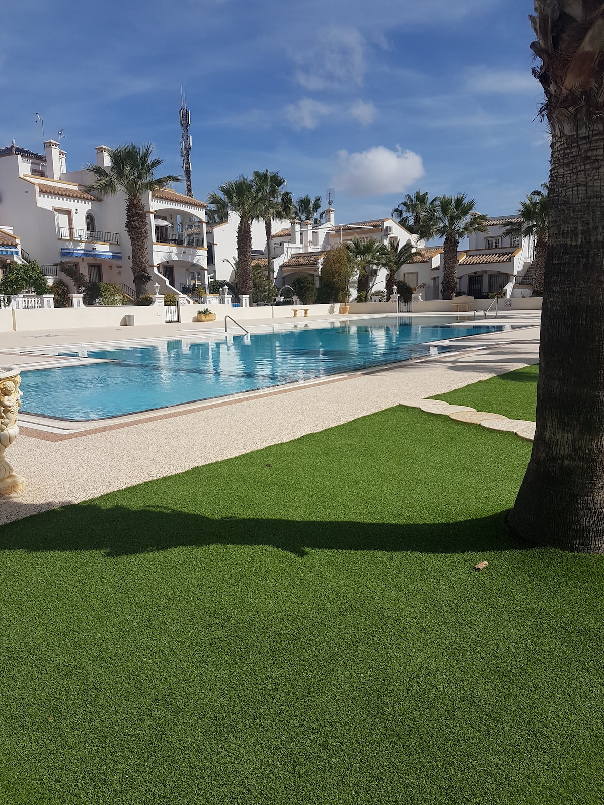 Preciosa vil·la amb piscina privada, 3 dormitoris i 3 banys. Cuina totalment equipada amb rentaplats i bugaderia. El dormitori principal té balcó i el terrat ofereix unes vistes magnífiques del Mediterrani. Accés a una piscina compartida gran de 3 parts i a un jardí japonès. A prop de La Zenia Boulevard (1 km) i de la platja de La Zenia (2,5 km). Es recomana cotxe. La roba de llit no està inclosa; es pot llogar.