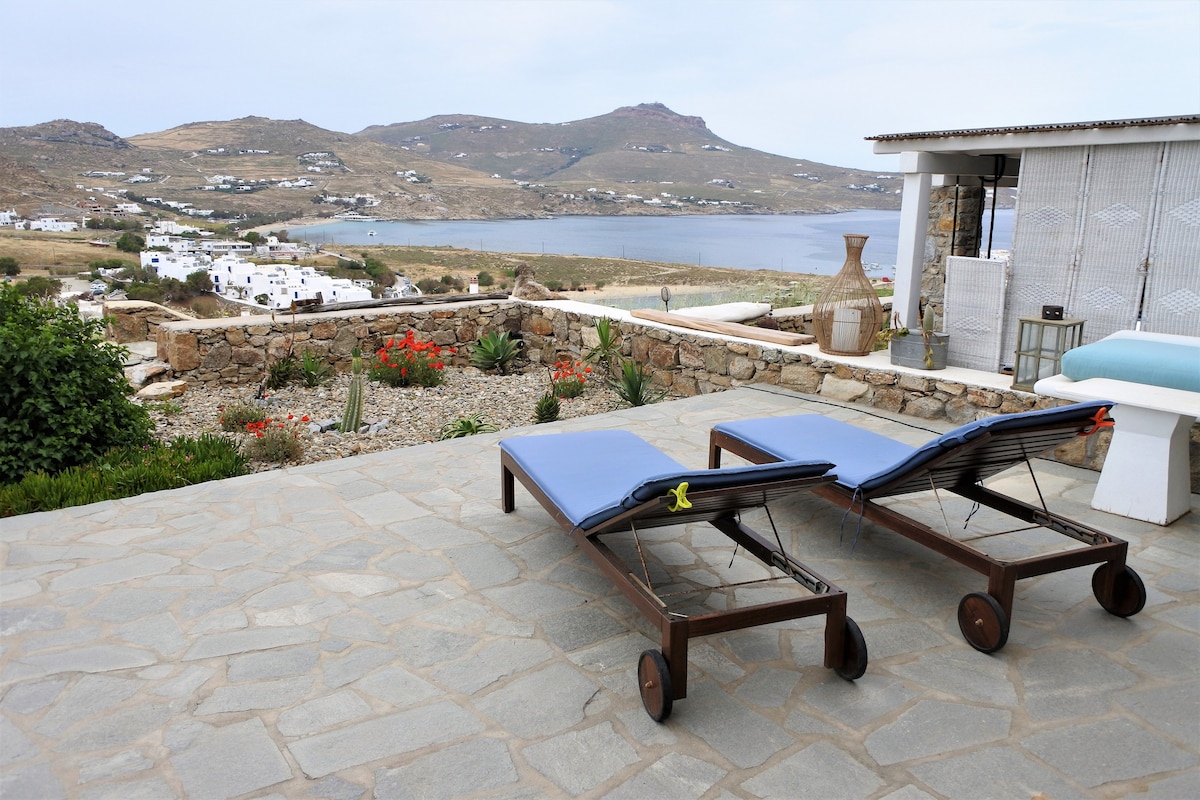Una vil·la tradicional ciclàdica amb una vista fantàstica de la platja de Kalo Livadi. Aquesta vil·la és tan impressionant com la zona de la badia, en absoluta privacitat, amb una magnífica vista de la badia grega de l'Egeu. La vil·la i els seus voltants són encantadors, en un ambient acollidor, per últim, però no per això menys important a poca distància de la platja.