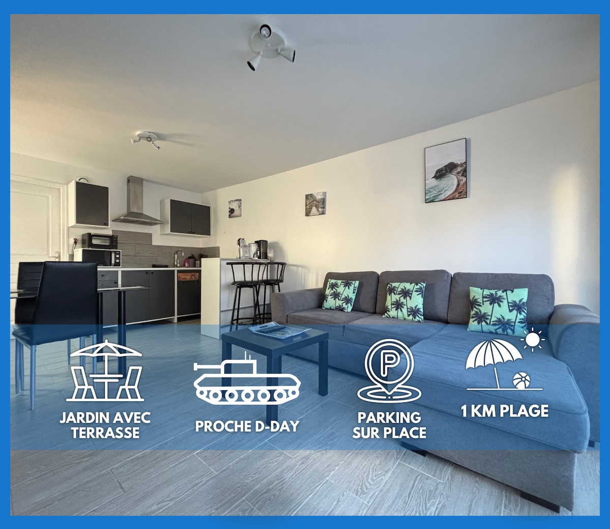 Casa propera a les platges d'aterratge, campanya tranquil·la de Normandia. La nostra casa té una capacitat màxima de 5 persones, consta d'un saló doble equipat amb sofà llit, sala d'estar amb TV, bany amb vàter, bany amb vàter, cuina totalment equipada. Un menjador Lavanderia: rentadora, planxa i taula de planxar. A dalt: entresòl amb llit individual i llit supletori. Una habitació amb llit doble. Wifi Jardí tancat amb garatge tancat.