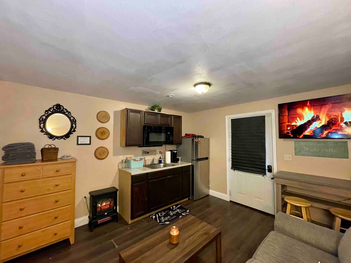 Tranquil·la't en aquest lloc tranquil i cèntric. La caseta és una casa separada. Tens la teva pròpia entrada per a la privacitat, el teu propi pati tancat amb una graella i un port per a cotxes. Hem fet una renovació completa i hem afegit una nevera nova i una rentadora i assecadora noves. Estris de cuina nous. Plats, cafetera, etc. També hi ha mobles nous. Estem orgullosos de la nostra feina i estarem encantats d'obrir-te les portes de casa nostra. Llit «king size» i matalàs inflable doble.