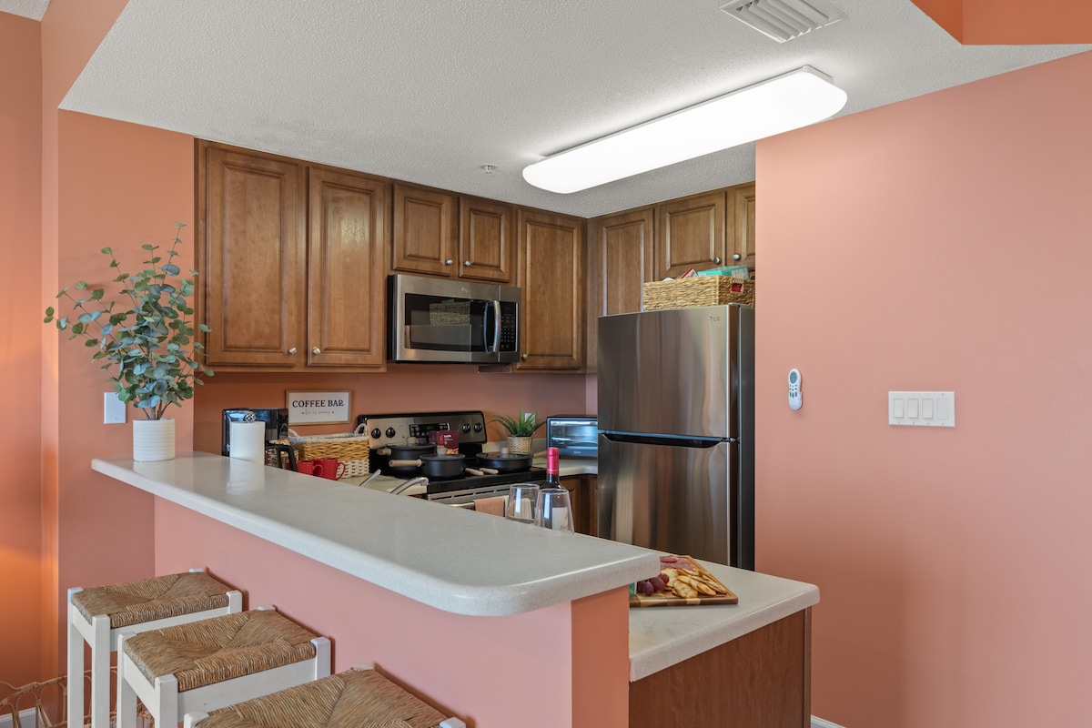 Un dels elements més exquisits del condomini és la vista des de la sala d'estar que inclou un balcó privat accessible tant des de la sala d'estar com des del dormitori principal amb una taula alta i tamborets de bar. Aquesta unitat inclou pisos i electrodomèstics actualitzats. L'allotjament té capacitat per a 8 hostes còmodament amb un llit king al Master, 2 llits dobles al segon dormitori i un sofà a la sala d'estar que funciona com un llit queen. El lloguer inclou 2 cadires de platja i paraigües de l'1 de març al 31 d'octubre.