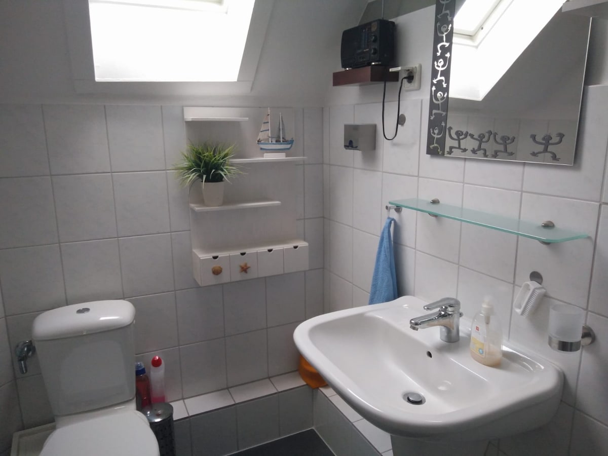 Acollidora habitació d'hostes amb entrada independent des de l'exterior i seients al camp. Bany privat amb dutxa i vàter. Situat en un tranquil assentament EFH al districte de Wulsdorf. Llit doble 1,80 x 2,00 m, televisor, nevera, torradora, forn microones, cafetera ibullidor. Tovalloles i roba de llit de forma gratuïta. Màxim 2 adults + nen petit Si cal, sol·licita-ho manualment. Supermercats, pastisseries, gasolineres, transport públic, a poca distància a peu.