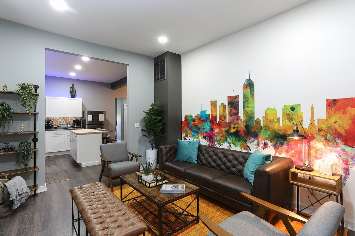 El teu oasi urbà al centre de la ciutat! Aquest elegant refugi és la teva llar lluny de casa teva amb dos televisors de 65 polzades. Gaudeix d'un llit «king size» amb l'opció de sofà llit i d'un llit plegable per a 2 hostes més. La seguretat compleix la comoditat, ja que estàs a pocs passos de Gainbridge Fieldhouse, Lucas Oil Stadium i el Centre de convencions. Explora Mass Ave, museus i una gran varietat de restaurants i llocs d'oci nocturn, tot a poca distància a peu. Aquesta joia no durarà, reserva ara per gaudir d'una estada inoblidable!
