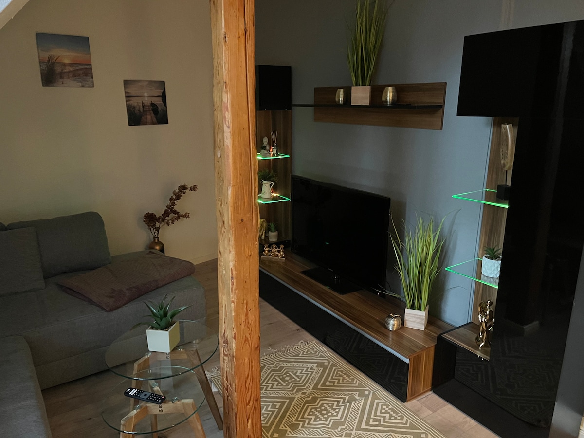 Acollidor pis (aprox. 75 o 90 m²) en una casa de entramat de fusta anunciada. Cuina espaiosa i totalment equipada amb estufa de rajola, sala d'estar amb sofà llit, racó de lectura i estufa de rajola, 1 dormitori (1-2 persones) o 2 dormitoris (a partir de 3 persones), cadascun amb llit doble, bany amb dutxa i sauna. Wifi a tot l'apartament amb accés gratuït a internet. Calefacció central a totes les habitacions. Jardí privat. Disponible per un cost addicional: Trasllat des de l'estació, servei de compres, lloguer de bicicletes, canoa, gimnàs