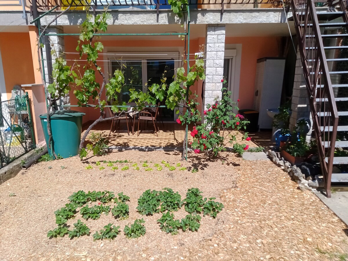És una casa de dues plantes amb dos apartaments a Strunjan, prop de Piran, en una ubicació molt tranquil·la i verda, envoltada d'oliveres, vinyes, figueres i altres plantes mediterrànies, a 600 m de la platja més propera a la badia de la Lluna. És la nostra casa de vacances i estem fent servir l'apartament de la planta baixa per nosaltres mateixos (principalment els caps de setmana i festius). El teu apartament es troba al primer pis.
