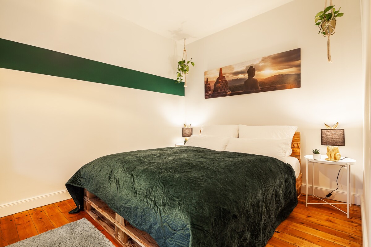 4 habitacions precioses i espaioses en una ubicació molt tranquil·la. 1 dormitori amb llit doble (200 x 200 cm), 1 habitació amb llit gran (140 x 200 cm) i un llit d'hostes (90 x 190 cm) 1 WoZi amb sofà, taula de menjador, televisor, 1 habitació principal i dutxa. Matalàs plegable addicional al terra disponible a petició. Microones, nevera, cuina d'aigua calenta, plats, etc., però no hi ha estufa pròpia. Si cal, la cuina (una planta més alta) es pot utilitzar després d'un breu acord. REWE amb fleca a poca distància a peu.